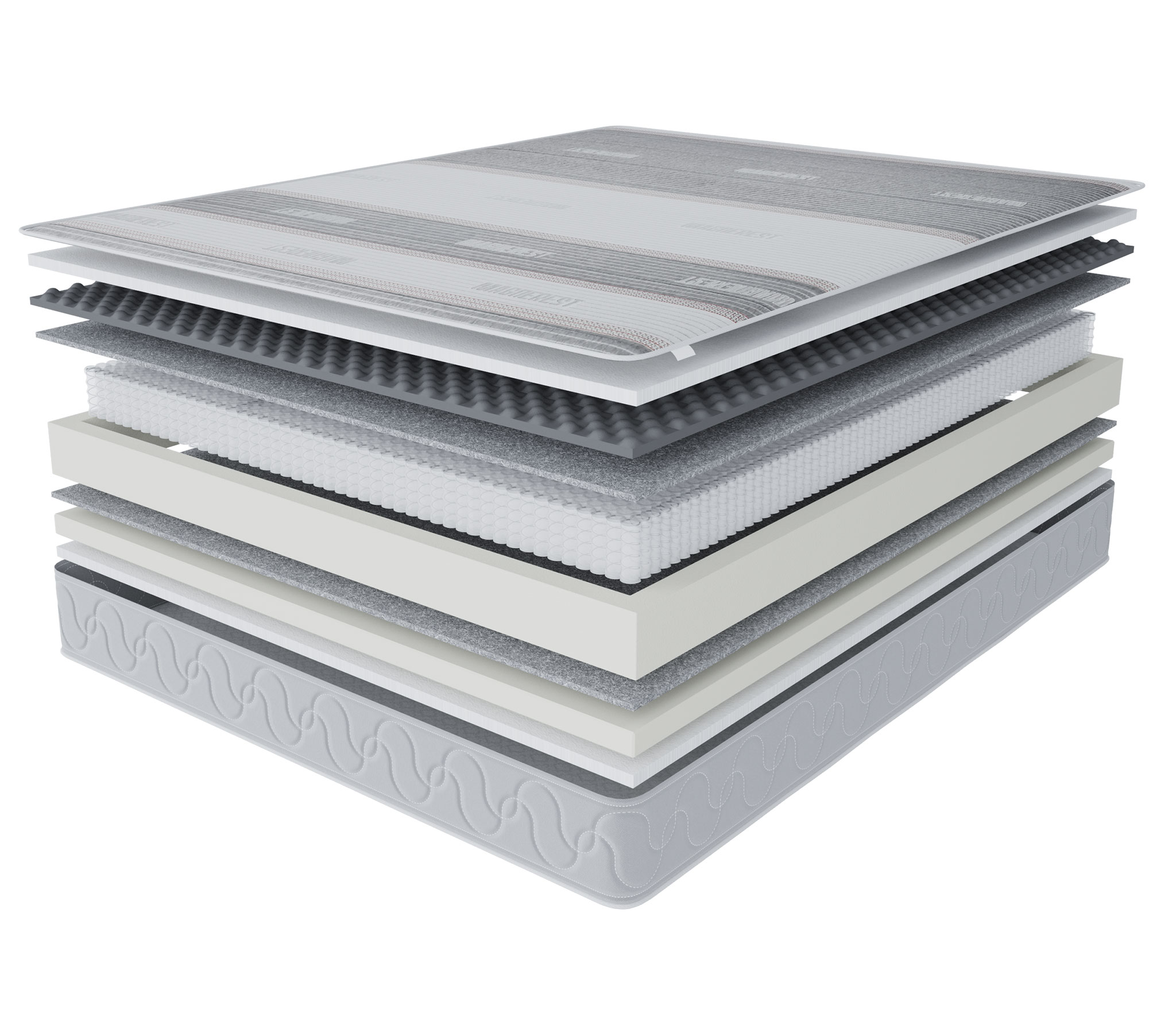 Матрас сочетает в себе внешнюю красоту чехла, который делается из премиальных тканей из 100% вискозы, и высочайший комфорт, который обеспечивают независимый блок пружин (820 шт/ спальное место) и высокотехнологичные ортопедические пены. Благодаря такому количеству пружин матрас может выдержать достаточно высокие нагрузки (до 140 кг/ спальное место), а также точнее подстраиваться под форму спящего. На этом матрасе себя будут комфортно чувствовать пары с большей разницей в весе, эффекта «скатывания» не будет. Данная модель является универсальной и подойдет почти любому, а внешний вид матраса не оставит равнодушным даже самых требовательных покупателей. С одной стороны матраса, в качестве комфортного слоя, используется высокоупругая пена толщиной 4 см, которая равномерно распределят нагрузку по блоку, а с другой стороны- пена мемори с угольной пропиткой и эффектом микромассажа, который достигается за счет ячеистой структуру самого листа пены, эта сторона матраса максимально точно повторяет контуры тела и запоминает их. Чехол матраса стегается на синтепоне плотностью 1000 гр/м2, что создаст эффект перины для людей с весом ниже среднего. Матрас идеально сочетается с кроватью Пассаж, которая изготавливается в той же ткани (Glory 110), что и бурлет (бок) матраса, таким образом матрас гармонично сочетается с кроватью, а вместе они создают законченную композицию.