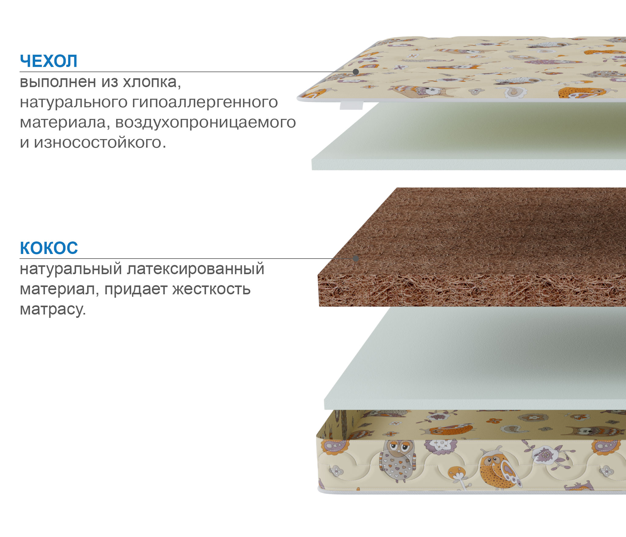 Тонкий, прочный, жесткий матрас, который сделан без применения клеящих составов и подойдет даже для самых маленьких и дорогих сонь. Чехол матраса сделан из 100% хлопка.