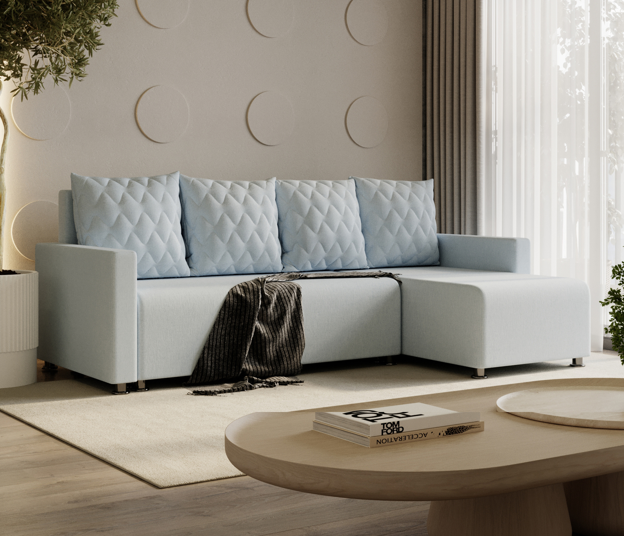 Простой и практичный угловой диван Челси с популярным механизмом трансформации «Еврокнижка», вместительным бельевым ящиком станет центральным интерьером классической гостиной, уголка отдыха в домашнем кабинете или рабочем офисе и полноценной альтернативой двуспальной кровати в гостевой комнате или однокомнатной квартире. Угловая конфигурация модели обеспечивает рациональное использование метража помещения и исключает необходимость приобретения дополнительных мест для сидения, а мягкие подспинные подушки вызывают желание присесть и расслабиться.