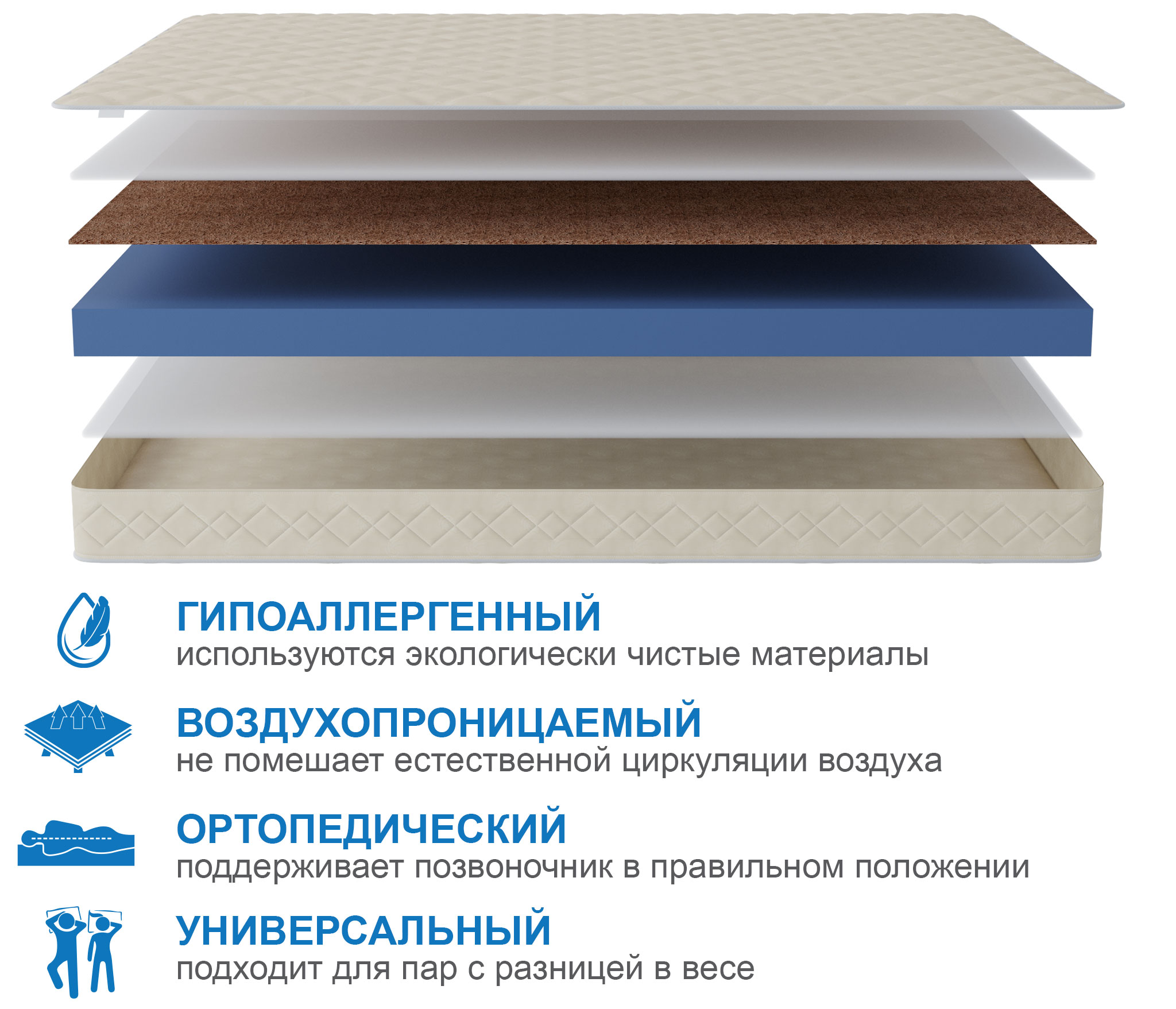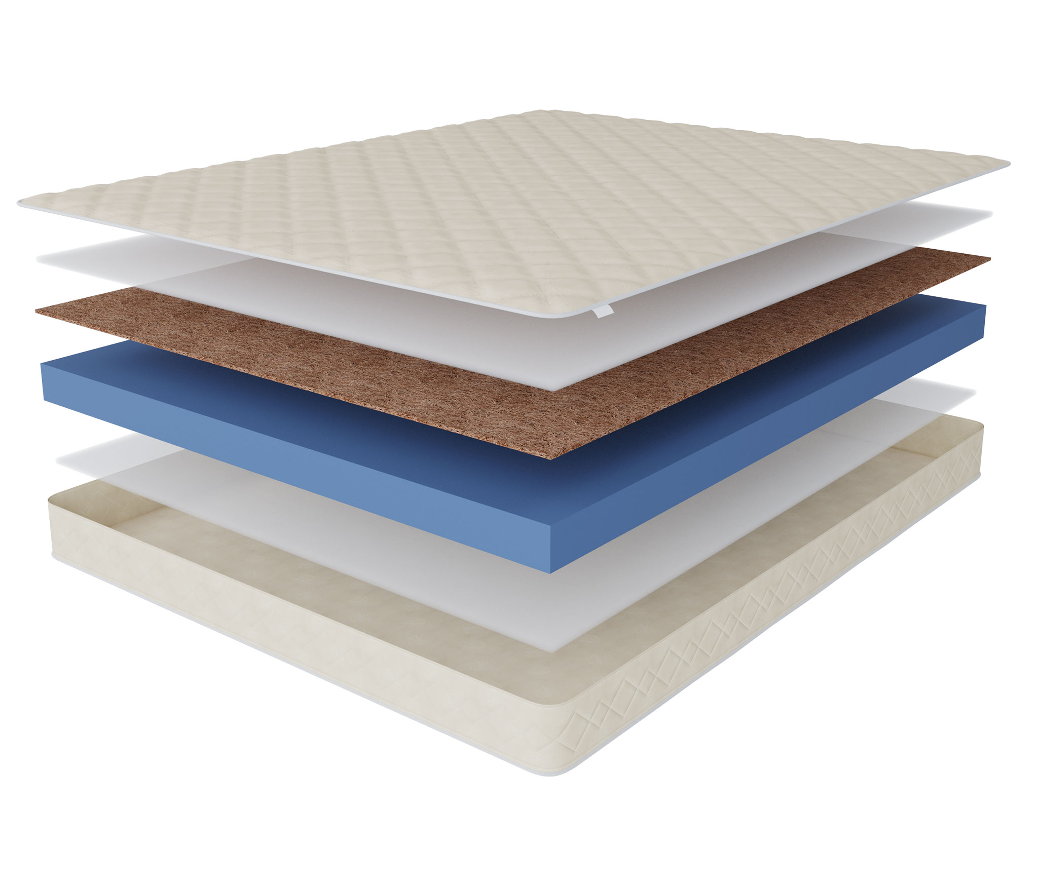 Отличный беспружинный матрас с разной степенью жесткости сторон. В качестве основы используется эластичная, но при этом довольно прочная и жесткая пена. Одна из сторон матрас дополнительно армирована листом латексированного кокоса, который придаст дополнительную прочность и жесткость. Матрас достаточно легкий и подходит для кроватей с подъемным механизмом, а так же для детских и молодежных кроватей с низким бортиком. При выборе матраса следует помнить о том, что любой матрас не отвечает за правильность положения головы и шеи, их здоровье зависит от правильно подобранной ортопедической подушки. Для увеличения срока службы матраса рекомендуется его использование с защитным чехлом AquaStop.