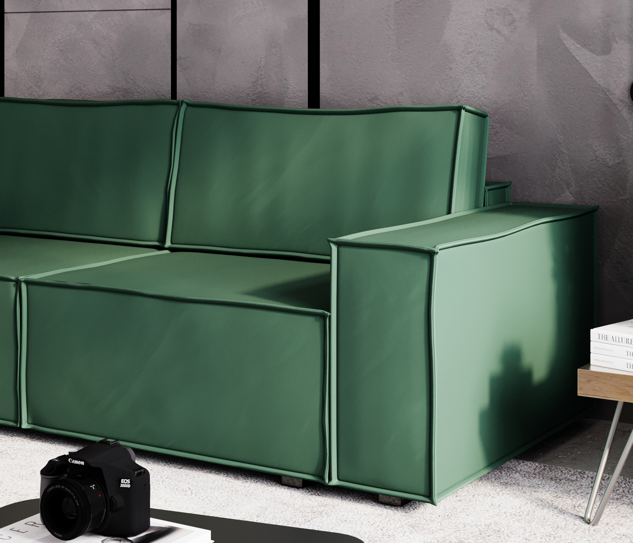 Диван выполнен из однотонного велюра без «пальчикового» эффекта.Antistratching effect позволяет ткани не вытягиваться и долго сохранять первоначальный вид.