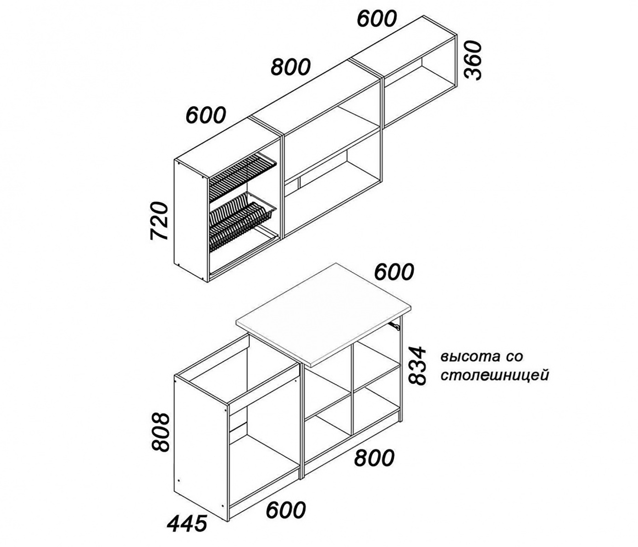 Рекомендуется установка накладной мойки шириной 600 мм (в комплект не входит).
