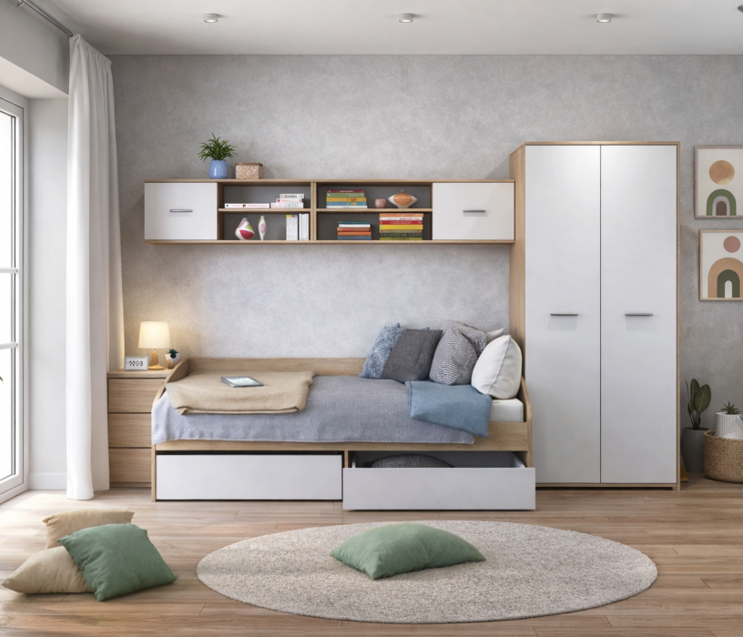 Комплект детской мебели «Мамбо»– идеальный вариант для комнаты подрастающего непоседы. Приятная глазу цветовая гамма придаст помещению современный и, в то же время, уютный вид. Корпуса мебели выполнены из ДСП в цвете «Дуб Сонома», фасады ящиков, полок и шкафа имеют светлый оттенок. Удобная и просторная кровать, оборудованная двумя вместительными выдвижными ящиками, обязательно понравится вашему ребенку, две настенные полки помогут создать и поддерживать в комнате надлежащий порядок, а 2-х дверный шкаф возьмет на себя функции по сохранению и складированию повседневных и праздничных детских вещей.