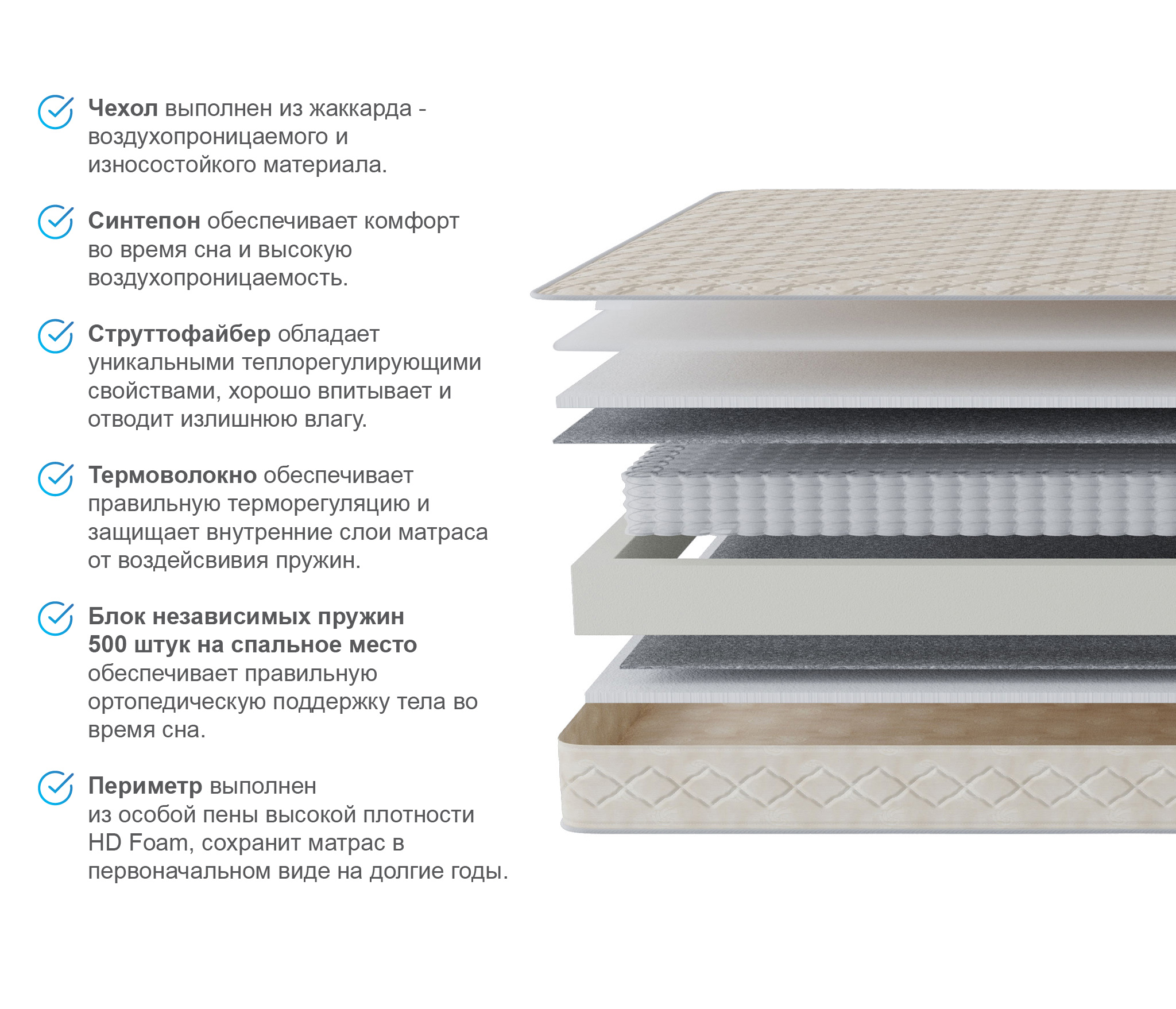 Матрас: СтруттоФайбер Лен Н20мм, блок независимый Poket spring Н140 мм, 256 пружин на 1м2, 256 пружин на 1м2, система усиления периметра матраса