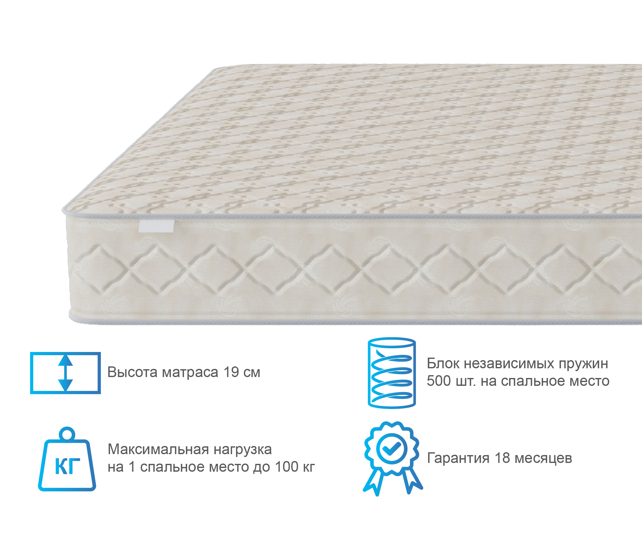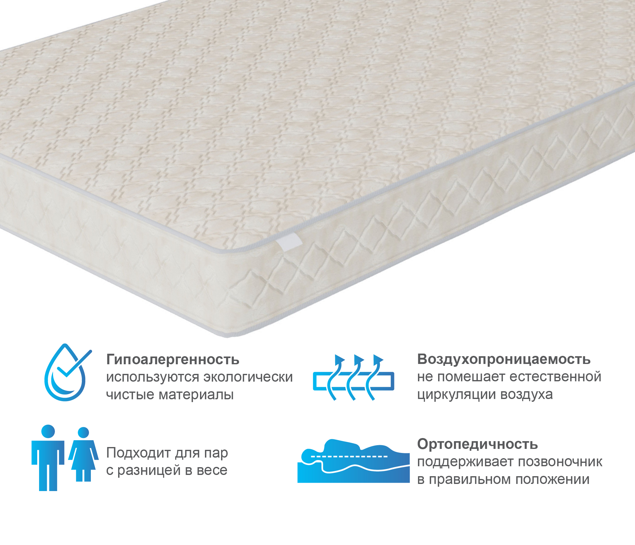Чехол из хлопкового жаккарда обеспечит надежную защиту матрасу и сохранит превосходный внешний вид на долгие годы. Материал экологически чистый, не вызывает аллергии и тем самым отлично подходит для людей склонных к аллергии. Модель рассчитана на нагрузку в 100 кг на одно спальное место.