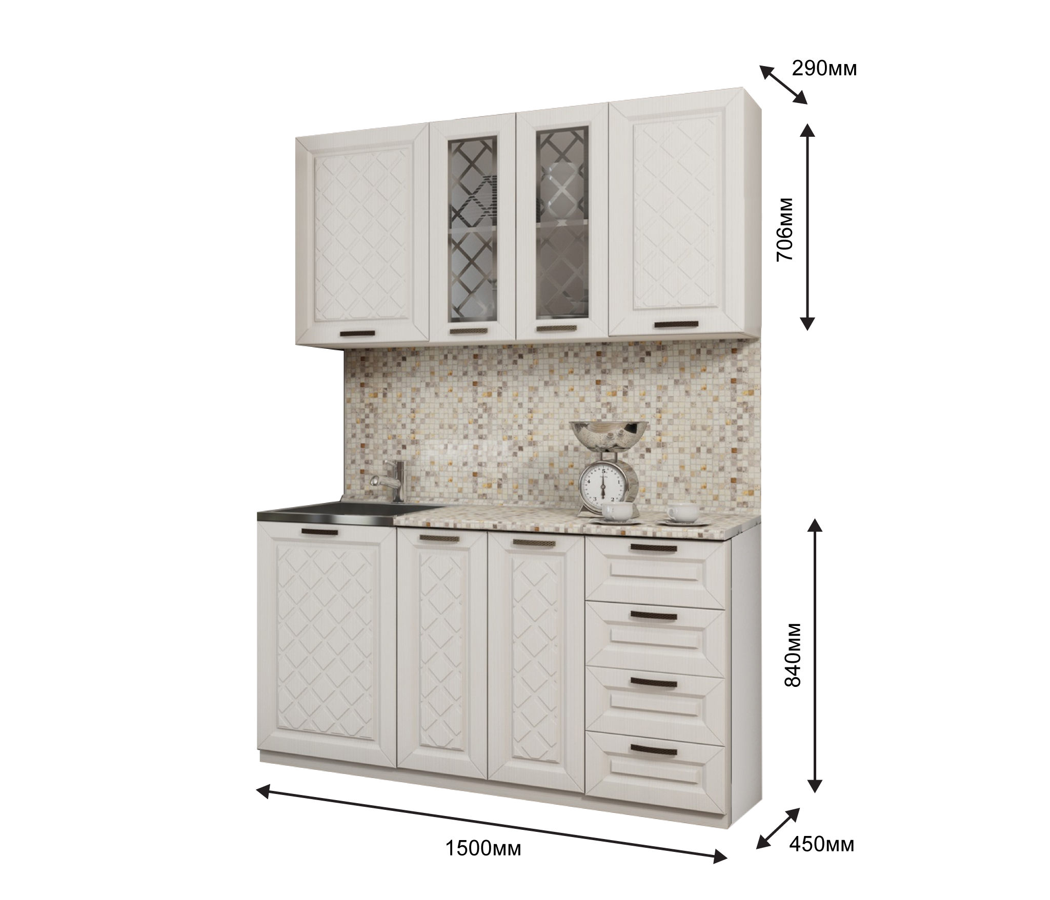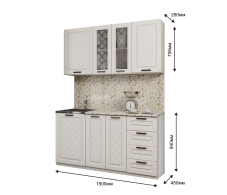 Высота нижних шкафов: 840 мм, верхних - 706 мм (нижние шкафы под мойку имеют высоту 810 мм).