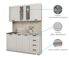 Декорирован фрезеровкой на фасадах и пескоструйным узором на стекле.