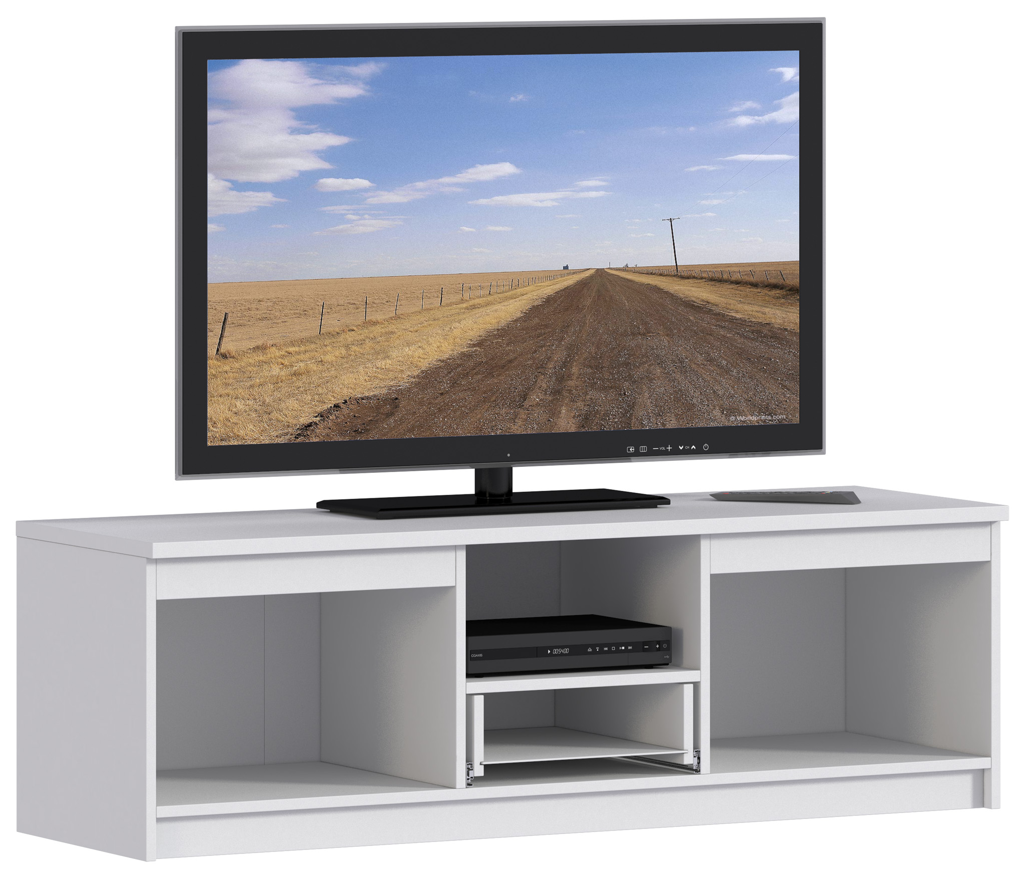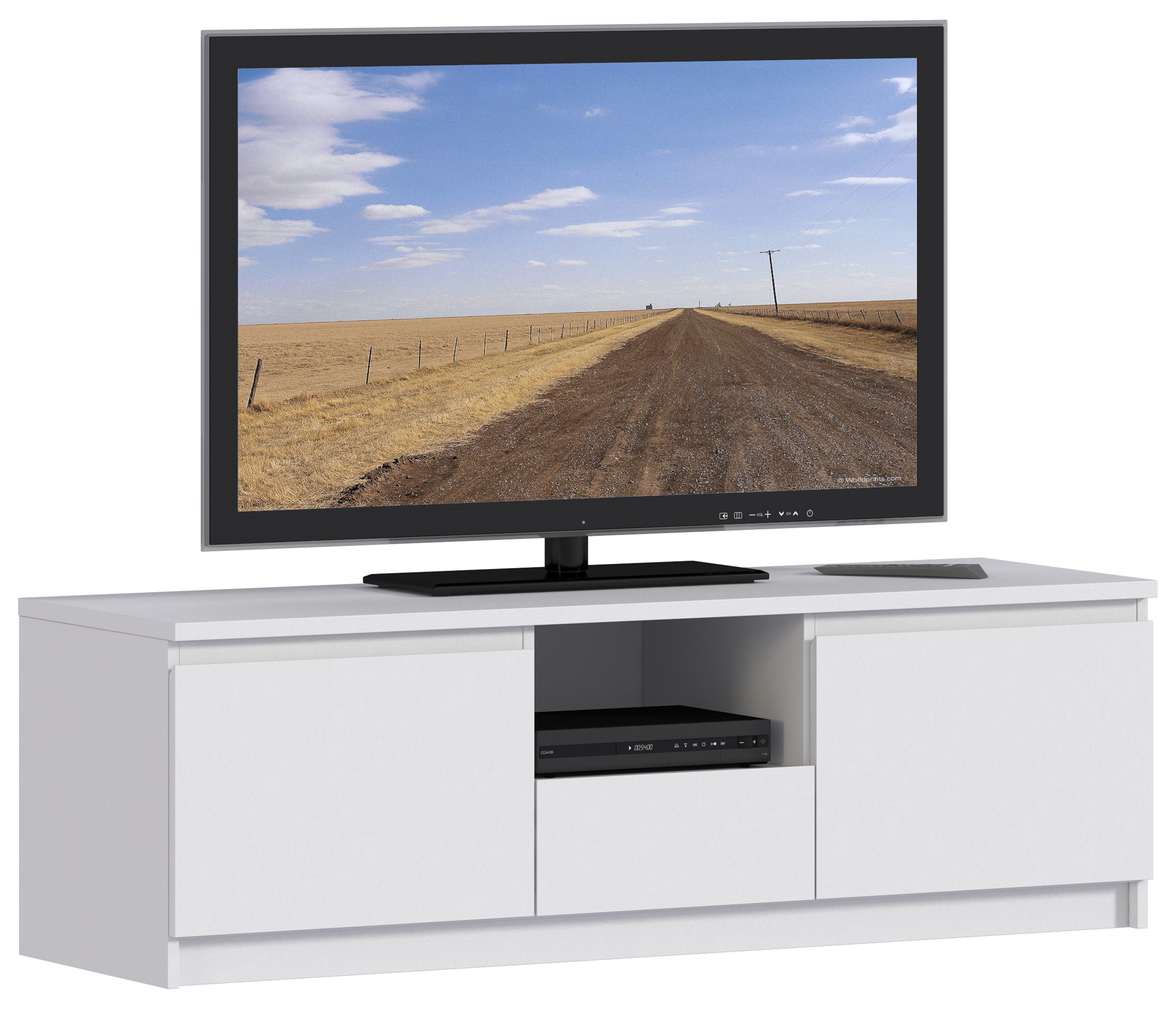 Габаритные размеры – ширина 140 см, высота 44 см и глубина 44 см. Вес тумбы 33,92 кг, что даёт возможность передвигать её по усмотрению. Визуально тумбу можно разделить на три отделения. В центре над выдвижным ящиком расположена открытая полка. По бокам два вместительных отделения за отдельными дверцами. Отличительной особенностью тумбы является отсутствие ручек, которые интегрированы в фасады. ¶Тумба выполнена в лаконичном дизайне из экологичного современного ЛДСП. Материал отделки устойчив к влаге и воздействию бытовых чистящих средств, что актуально для светлых поверхностей.