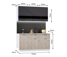 два нижних шкафа на 500мм с выдвижным ящиком и распашными фасадами и шкаф под мойку 500мм(без столешницы) - общая ширина 1500.Высота 840мм. Глубина 450мм.