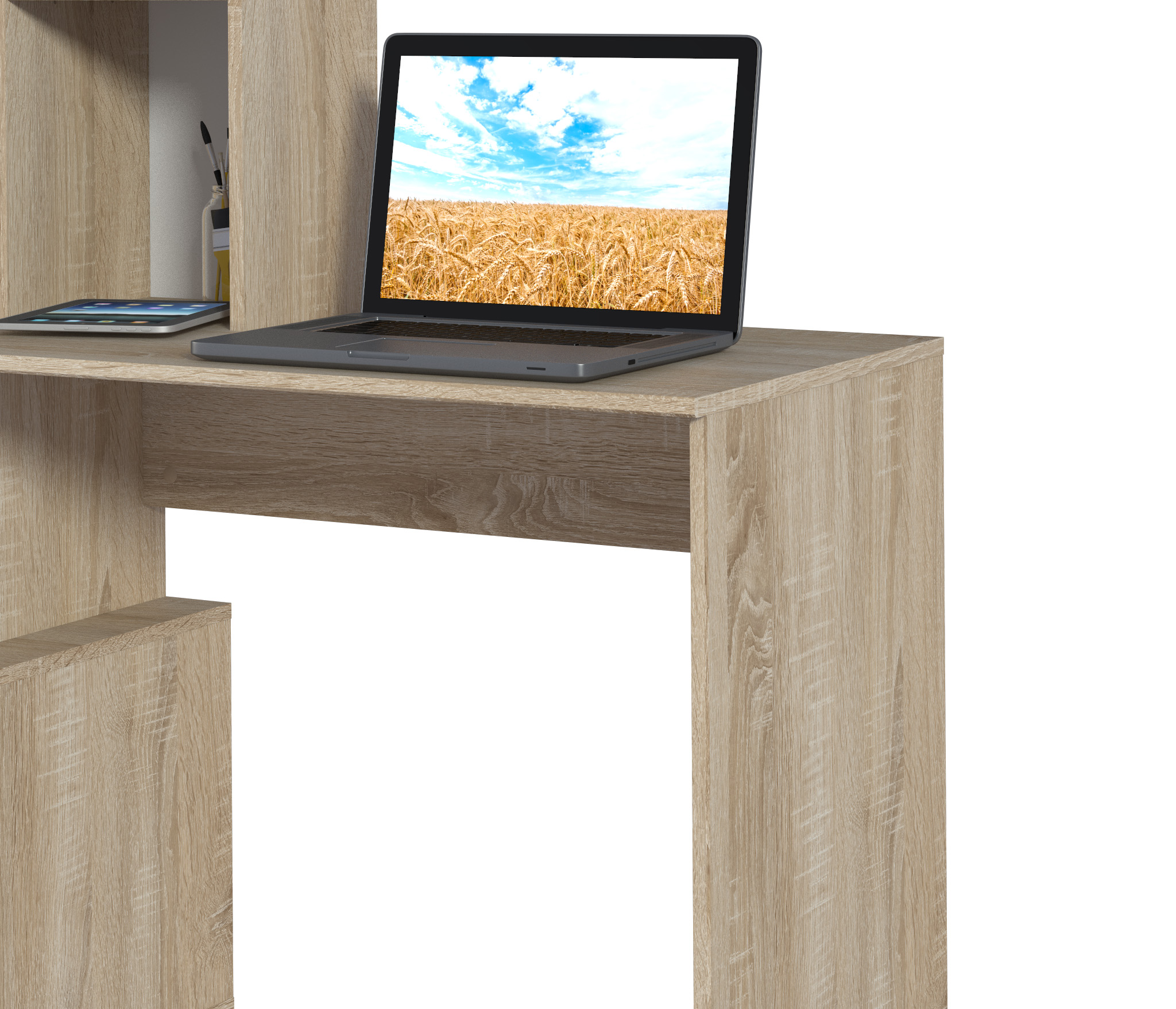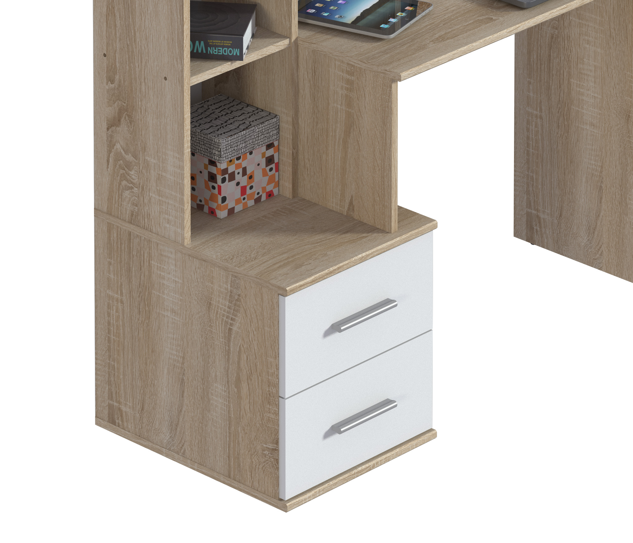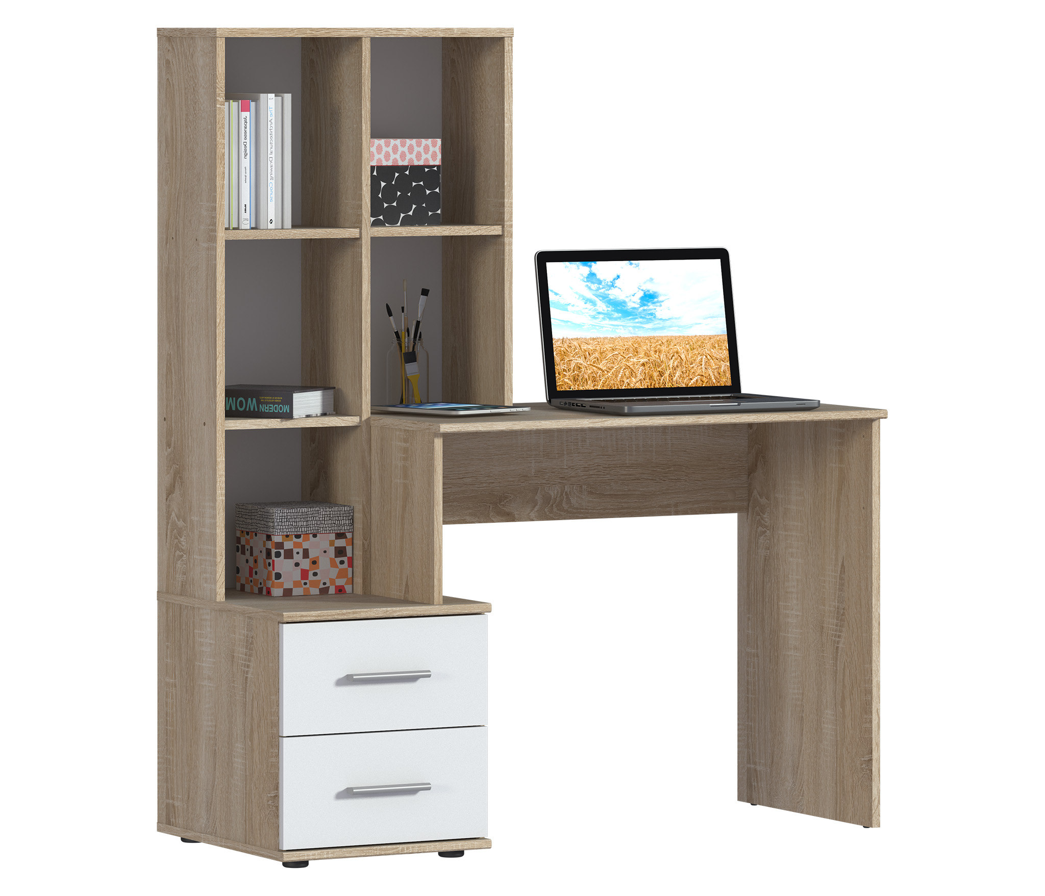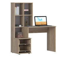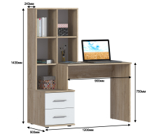 Стол Мамбо СБ-2998 – удобное и практичное рабочее место. Стол идеален в комнате школьника или студента, в кабинете или в офисном интерьере. Габаритные размеры – ширина 120 см, высота 143 см и глубина 50 см. Под рабочей поверхностью расположена тумба с двумя выдвижными вместительными ящиками. Над рабочей поверхностью находятся удобные для хранения документов и книг полки. Стол производится из экологичного и прочного материала. Отделка комбинированная. Корпус, рабочая поверхность и поверхности полок выполнены в цвете «Дуб Сонома», а фасадные поверхности – белые. Материал отделки устойчив к влаге и воздействию бытовых чистящих средств. Стол Мамбо может быть как отдельным предметом мебели, так и частью гарнитура.