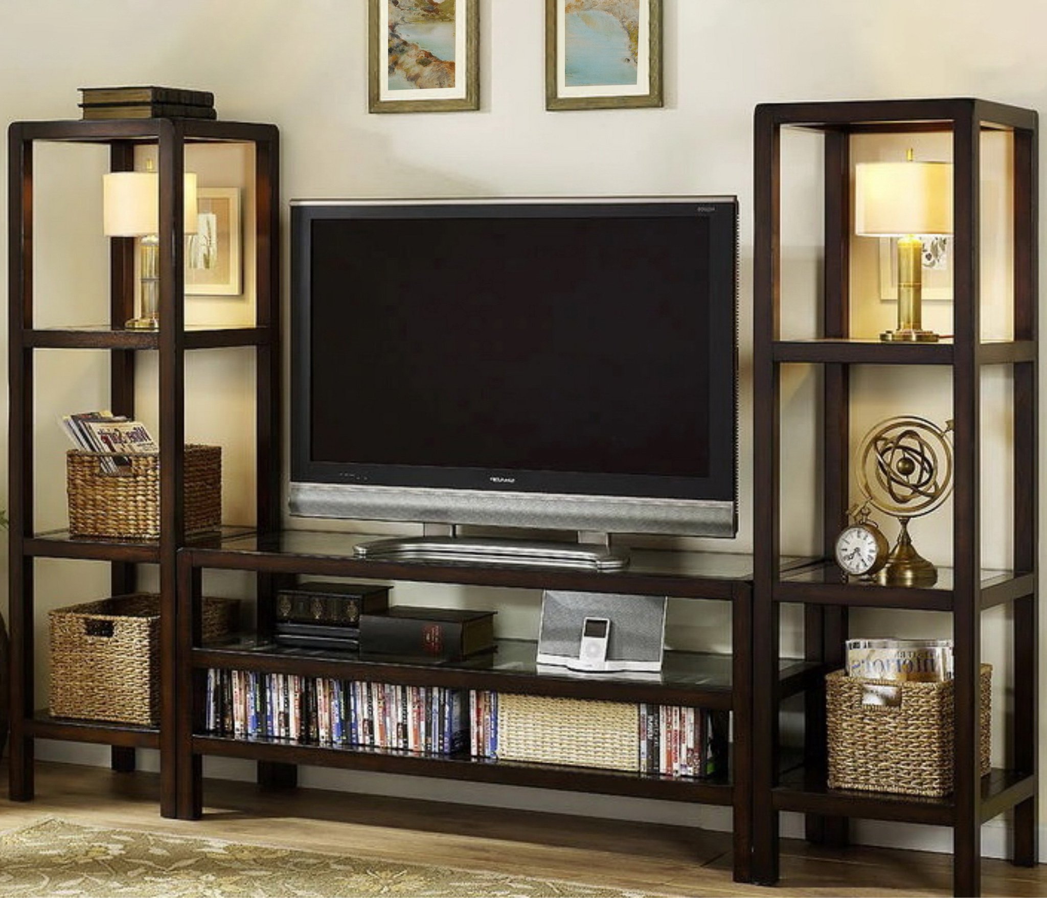 С ТВ тумбой , со стеллажом, глянцевые фасады, С полками