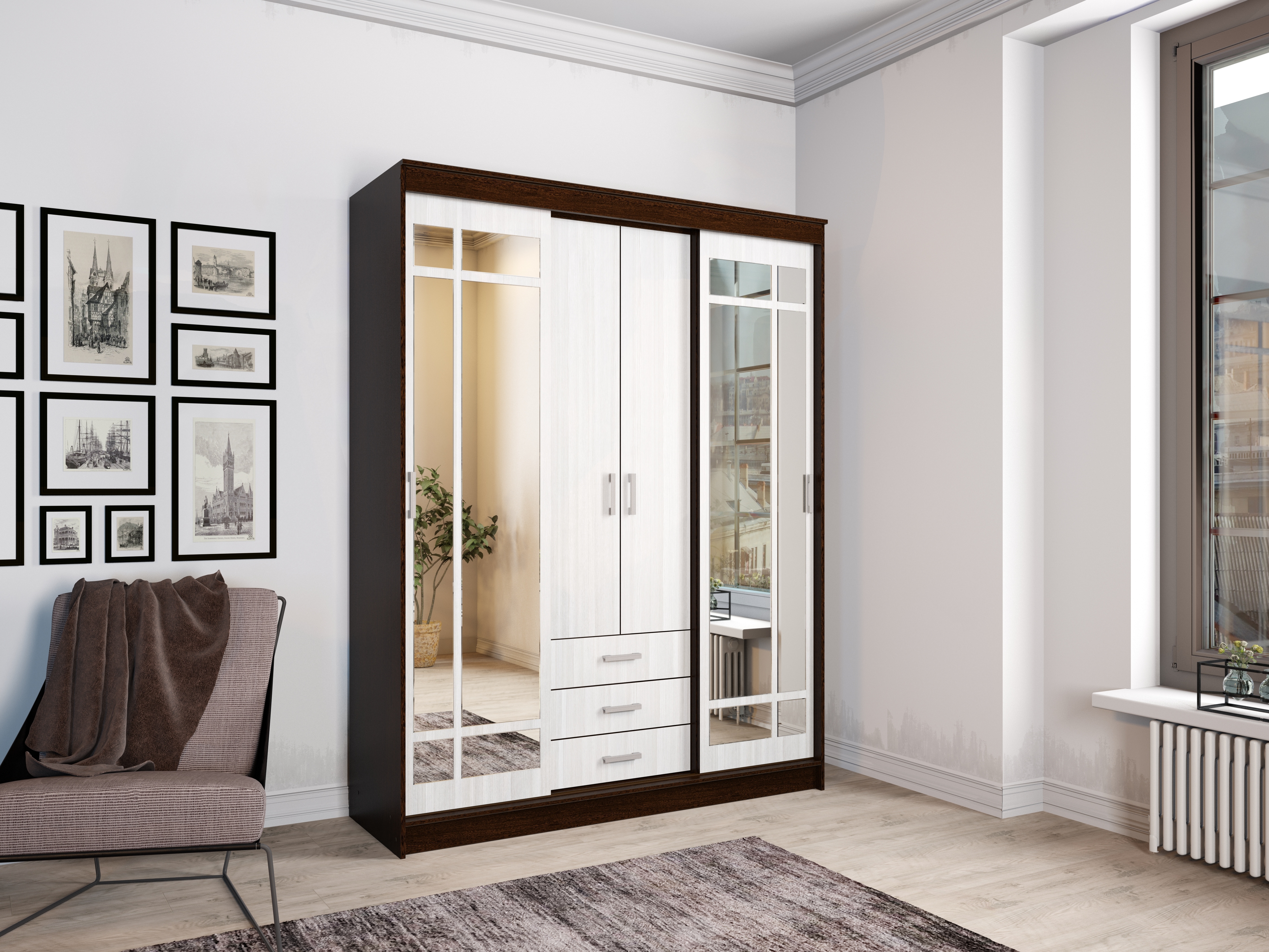 Содержит отдел с антресольной полкой и штангой для вешалок, отдел с полками, два выдвижных ящика и отдел с двумя штангами для вешалок. Зеркала входят в комплект. Материал ЛДСП, кромка ПВХ, зеркало