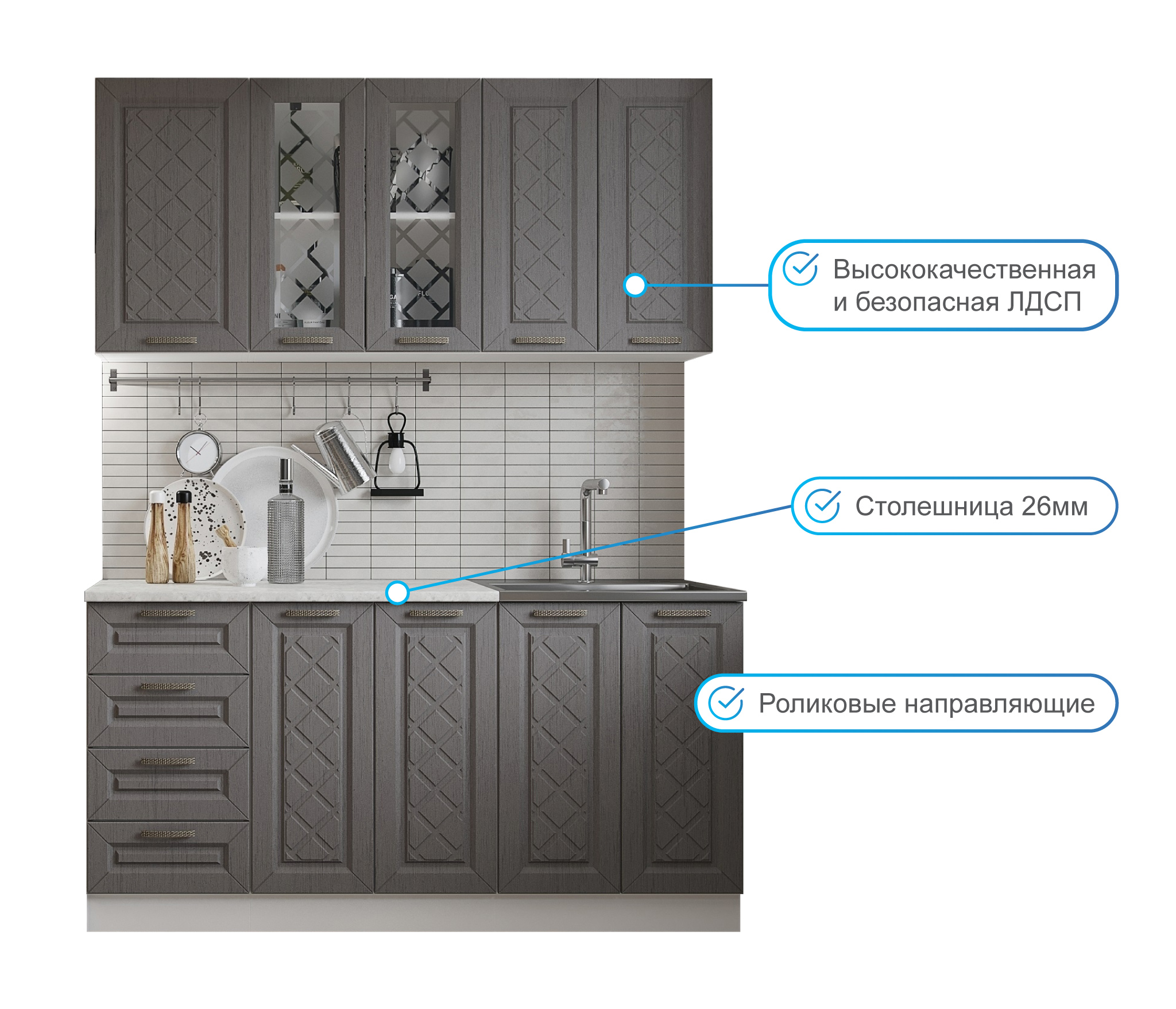 Высота нижних модулей указана с учетом столешницы, кроме модуля М600 под мойку. Мойка в комплект не входит и приобретается отдельно.