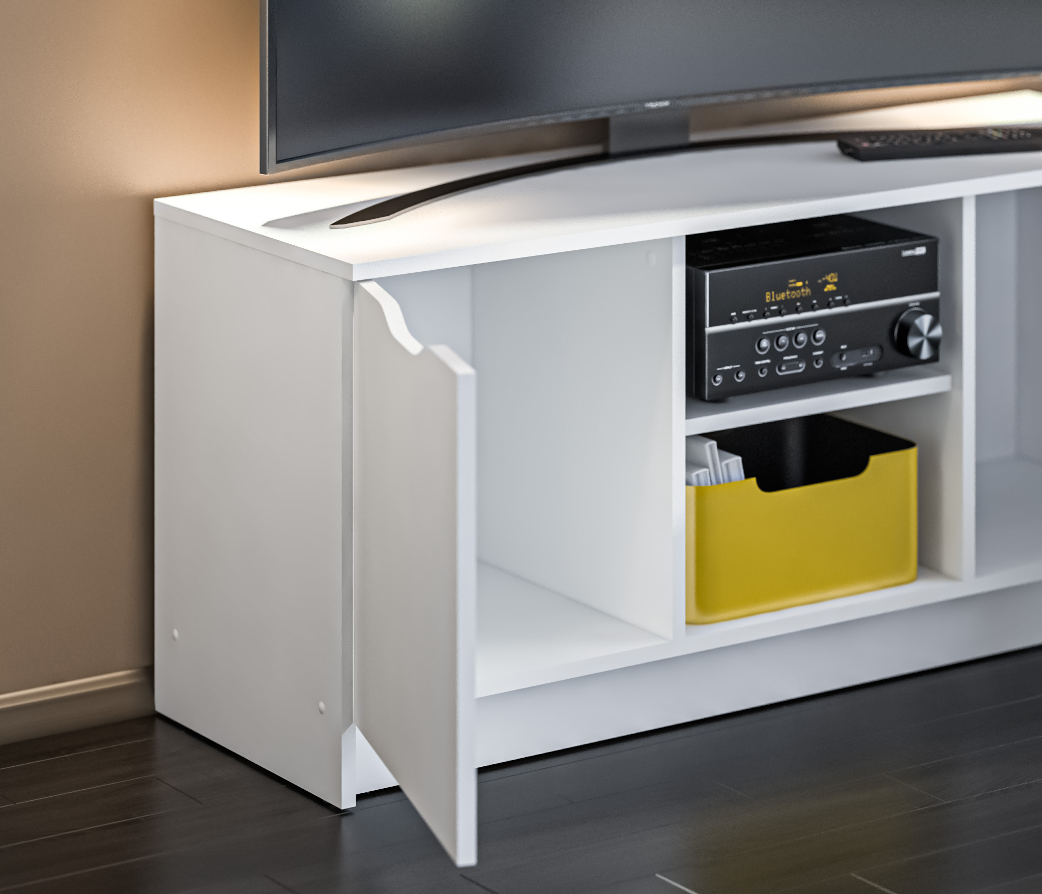 Габаритные размеры – ширина 119, высота 53 см и глубина 39 см. Вес тумбы 24,42 кг, что даёт возможность передвигать её по усмотрению. Визуально тумбу можно разделить на три отделения – открытое центральное с двумя полками для аудио или видео системы и два вместительных отделения с дверцами. Тумба выполнена в минималистичном дизайне из прочного современного материала ЛДСП.