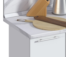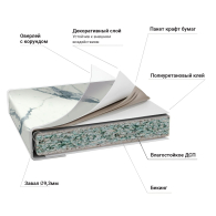 Основа – влагостойкое ДСП, толщиной 38 мм. Пластик толщиной 04-0,5 мм. Задний срез обработан меламиновой кромкой. Низ закрыт защитным покрытием бэкинг, которое защищает ДСП от влаги. Столешница оснащена уникальным каплесборником (специальная силиконовая накладка, монтируемая в паз на передней части столешницы снизу). Препятствует стеканию капель воды со столешницы на фасады и встроенную техник, расположен под углом 12,7 гр. Произведена на полностью автоматизированном немецком оборудовании. Поставляется в упаковке.