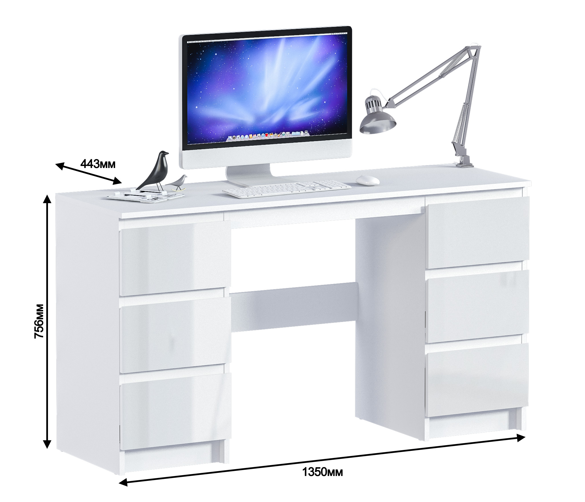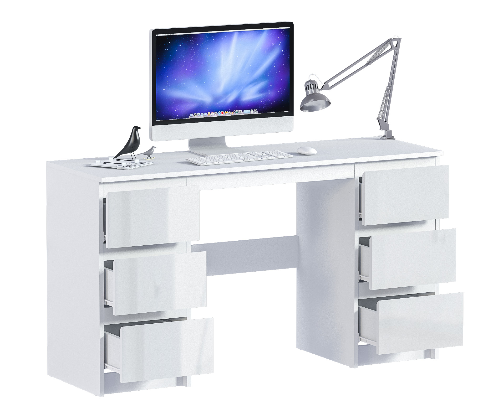 Компьютерный стол Медея СБ-3337 – удобное и продуманное рабочее место. Он не займет много места в кабинете, комнате школьника или студента, а также будет уместным в офисе. Габаритные размеры стола Медея – ширина 135 см, высота 75 см, глубина 44 см. Под рабочей поверхностью расположены две тумбы с тремя выдвижными ящиками каждая. Стол выполнен в минималистичном дизайне. Сам корпус в белом цвете, фасадные поверхности – в цвете «Белый глянец». Материал отделки устойчив к влаге, что оптимально для мебели белого цвета.