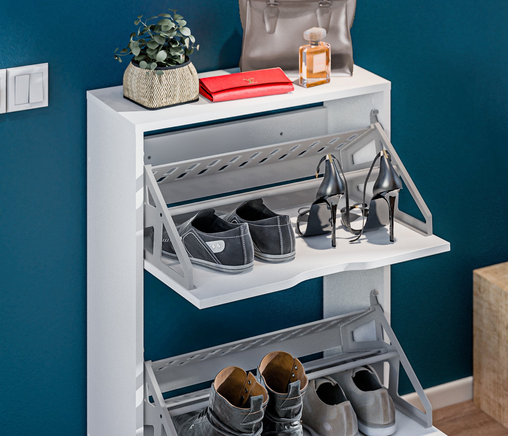 Габаритные размеры – ширина 59 см, высота 87 см и глубина 25 см. Обувница имеет два отделения, каждое из которых оснащено специальными стойками для хранения обуви. Прорезные ручки и строгие геометрические формы позволяют вписать обувницу в любой интерьер. Обувница произведена из экологичного прочного КДСП, устойчивого к мелким механическим повреждениям.