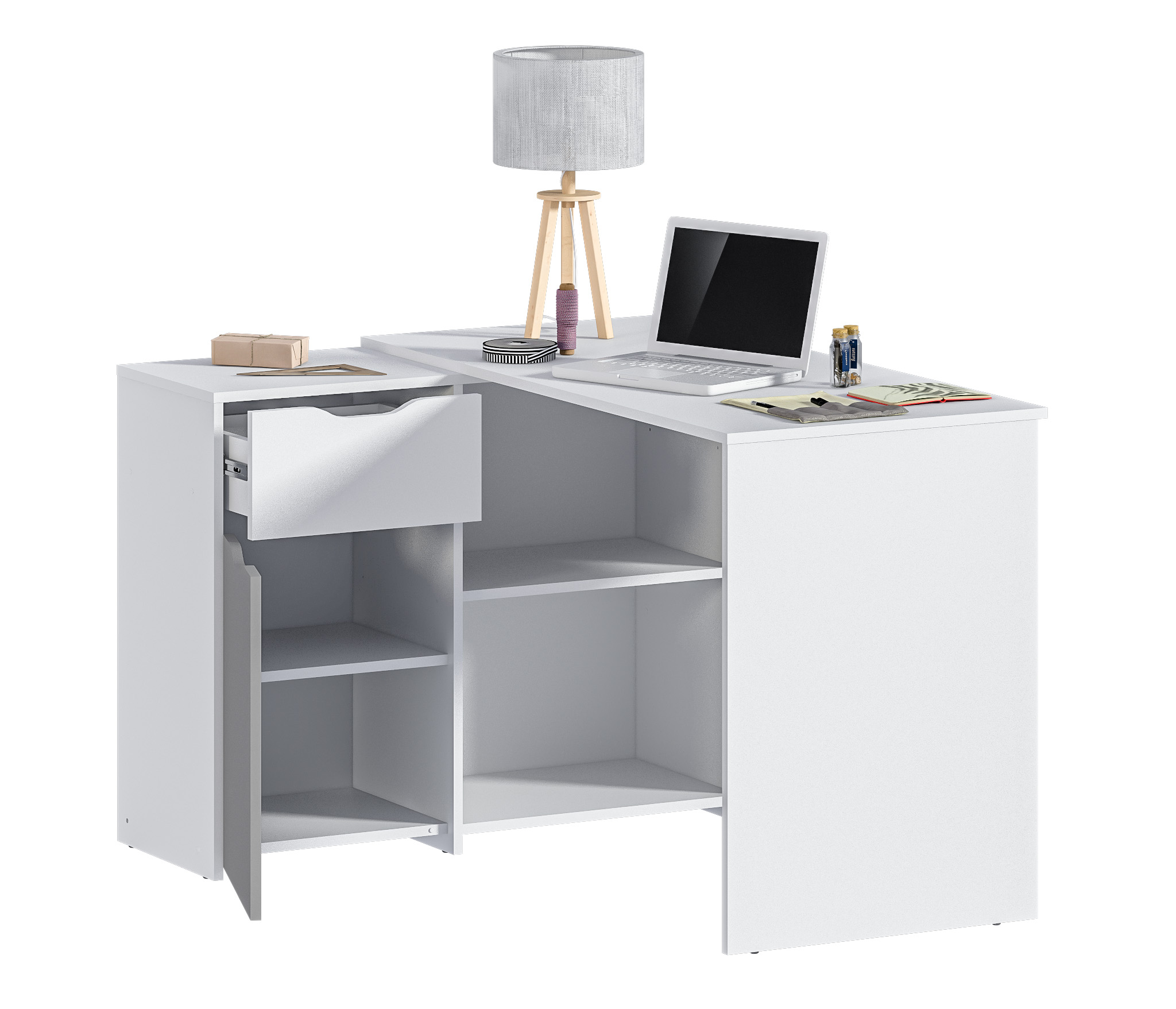 Дизайнерское решение угловой стол с ящиками и полками, в белом нейтральном цвете, без ручек, смотрится очень круто.Цена отличная, подросток в восторге, качественная сборка, доставка в свой день, оператор на связи в течение 2 часов.Спасибо.