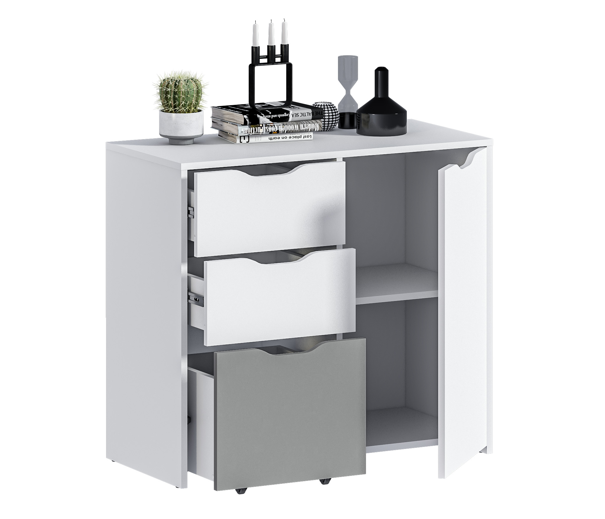 Комод Mika / Мика СБ-3282 – компактное и универсальное место хранения. Комод выполнен в современном сканди дизайне и является элементом модульного гарнитура Мика. Серия разработана для детских комнат или комнат подростков, хотя такой комод будет органичным и в офисе, и в кабинете. Габаритные размеры – ширина 85 см, высота 76 сам, глубина 40 см. Визуально комод можно разделить на две половины. Под одной дверцей расположено отделение с двумя полками. Другая половина оснащена двумя выдвижными ящиками и одним большим выдвижным ящиком на колесиках. Материал корпуса – ЛДСП с отделкой в цвете «Белый Альпийский». Фасады также из ЛДСП с комбинированной отделкой в цветах «Белый Альпийский» и «Серый перламутровый».