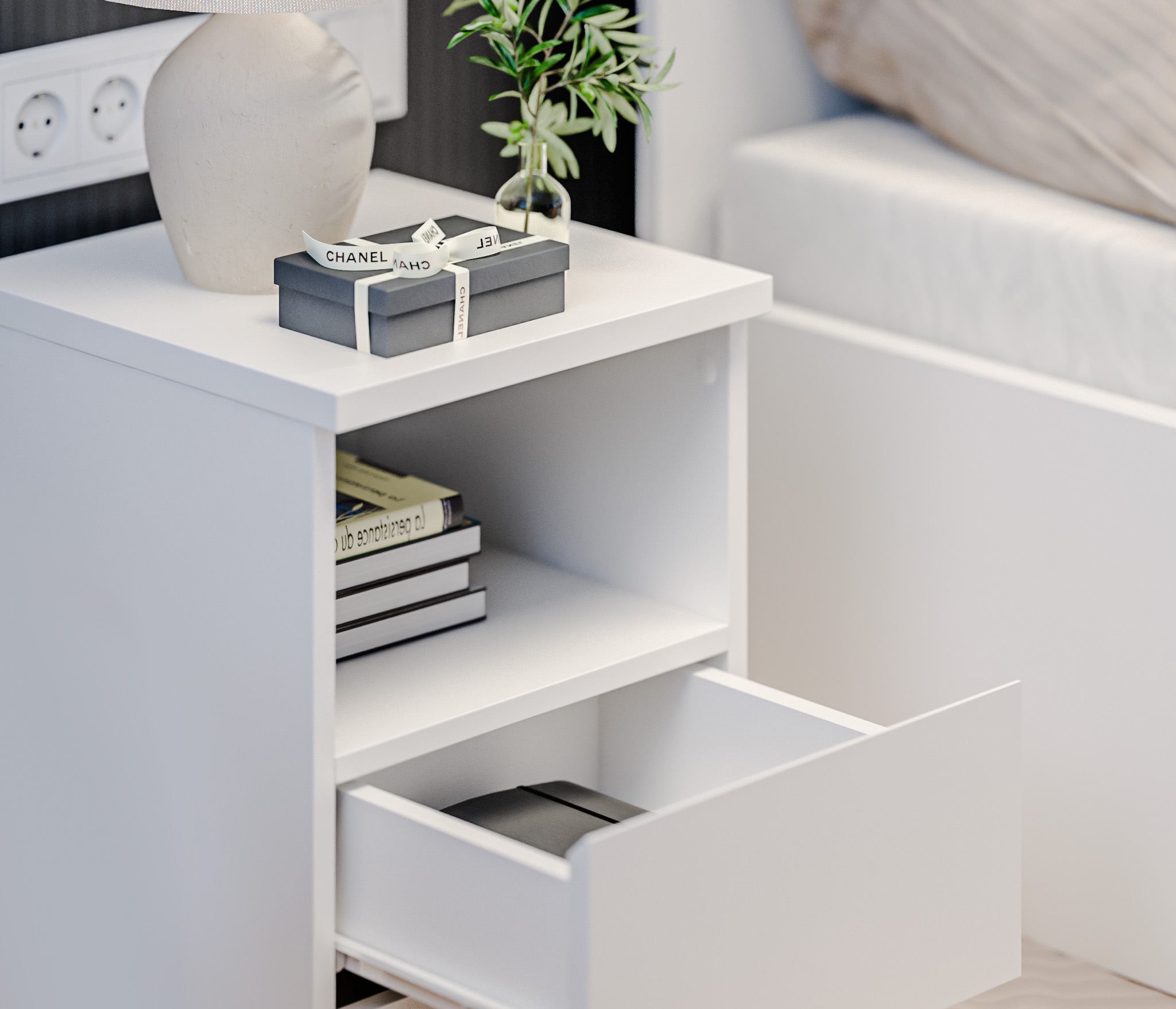 При компактных габаритных размерах – ширина 35 см, высота 44,4см и глубина 35,3 см, тумба довольно вместительная. Под столешницей расположены открытая полка и выдвижной ящик, куда можно положить планшет или книгу.