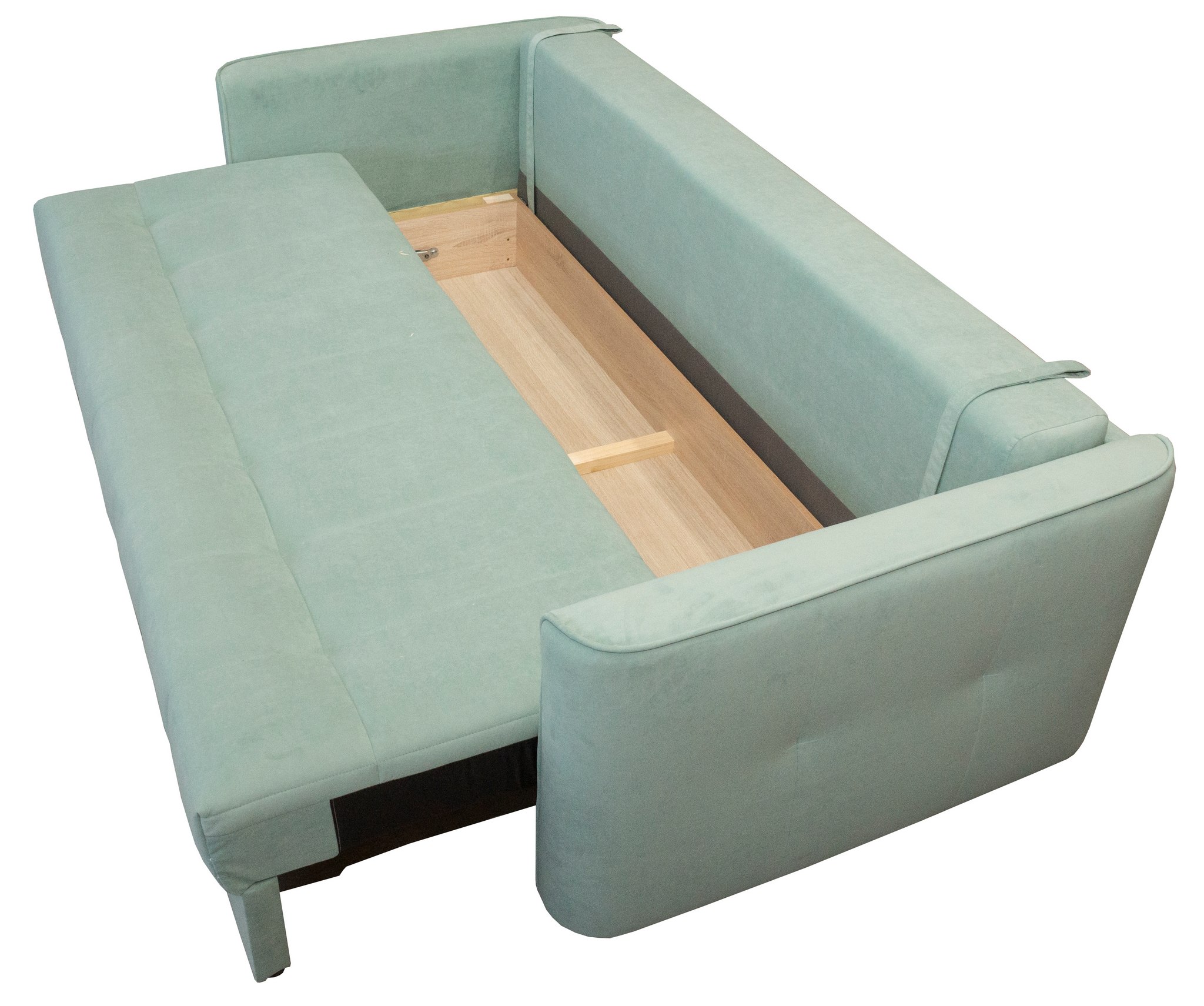Радиусные углы «сглаживают» изделие. Спальное место легко трансформируется в большую удобную кровать – механизм трансформации «Тик-Так» удобный и лёгкий в эксплуатации. Сиденье создано по технологии «Split Foam». Наполнитель изготовлен из рассечённой анатомической пены, соединённой в несколько слоёв. Сиденье средней жёсткости. Ортопедическое основание «Birch battens» - средней гибкости, на основе берёзовых лат. Идеально подходит для анатомических моделей.