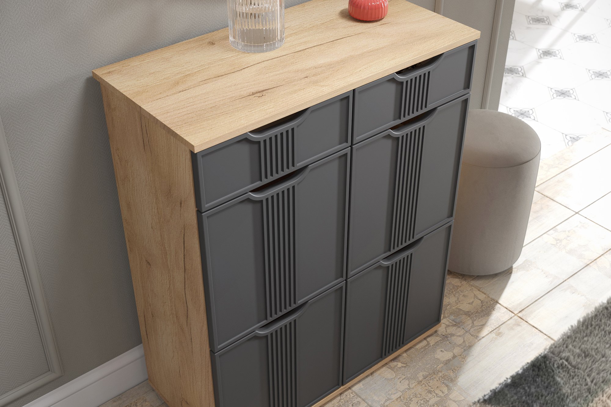 Комод Эмилия ЭЛ-20 изготовлен из ЛДСП 16 мм, фасады МДФ. Свес крышки в 30 мм обеспечит прилегание к стене с любым плинтусом. Фурнитура: телескопические направляющие полного выдвижения без доводчиков. Важная информация. Мебель доставляется в разобранном виде, в упаковках.