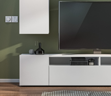 В состав стенки входит: тумба под телевизор с открытыми полками для видео, аудио аппаратуры и отделениями с непрозрачными дверцами, открытая полка для демонстрации коллекции декоративной посуды или памятных сувениров, закрытые модули для книг, посуды.