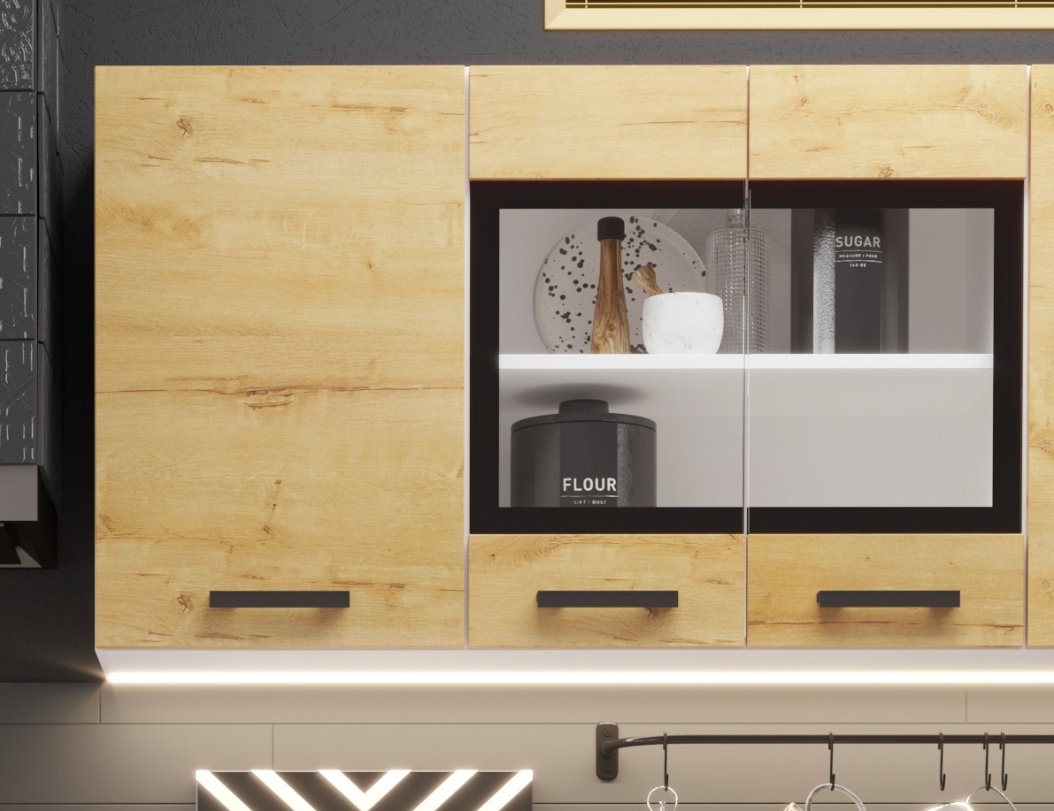 два верхних шкафа: первый шкаф - общая ширина 1000мм (400-глухой , 600-со стеклом) Внимание! Это единый элемент, разъединить шкафы невозможно! Второй шкаф - на 500мм. Высота 626мм. Глубина 270 мм.