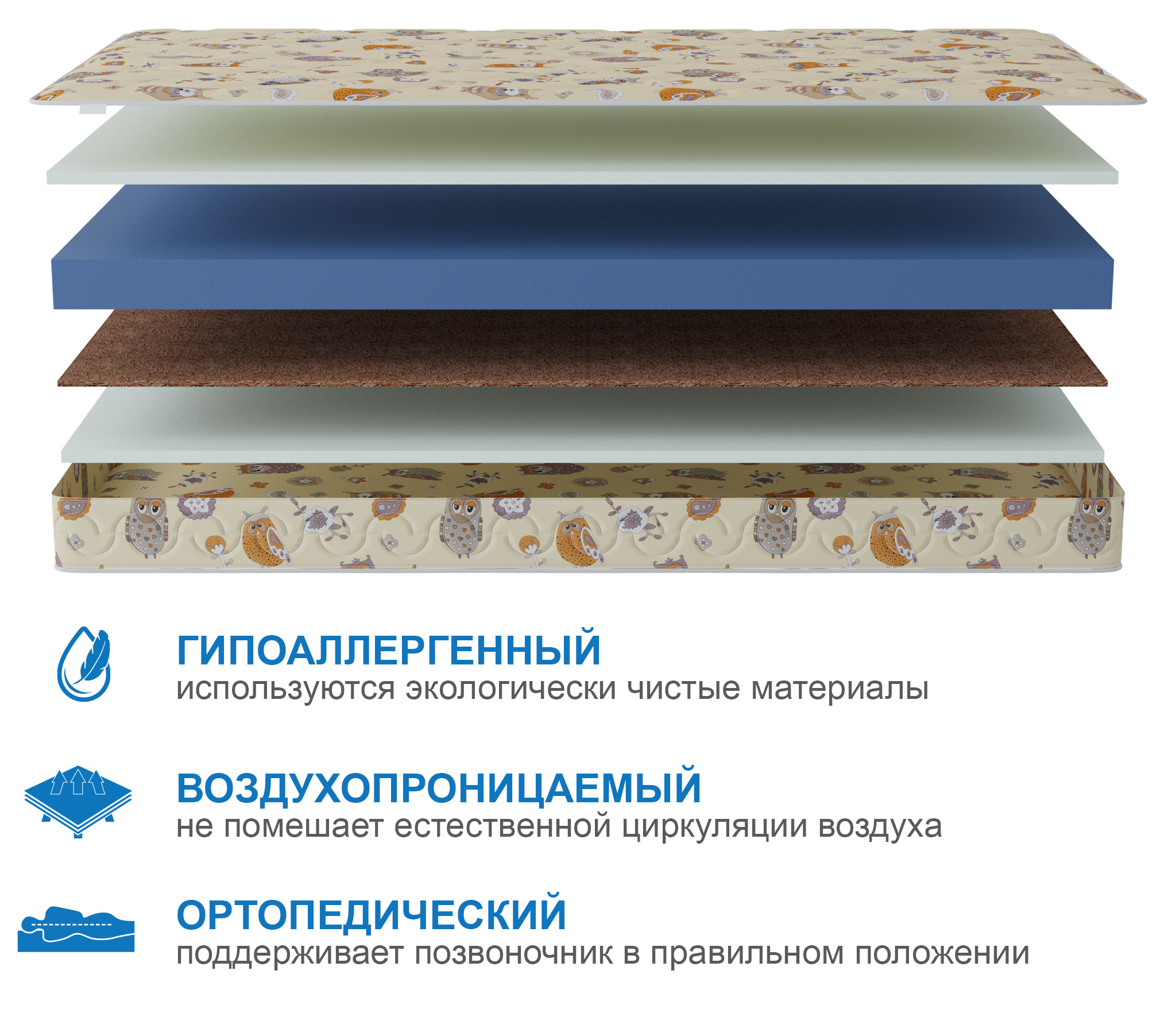 Двусторонний беспружинный матрас с чередующимися слоями холлофайбера (6 см) и более тонкого слоя латексированной кокосовой койры (1 см), за счет чего достигается разная степень жесткости сторон. Одна из сторон - максимальной жесткости для лета, вторая – более мягкая – для зимы. Модель поставляется в чехле из хлопкового стеганого трикотажа на синтепоне.