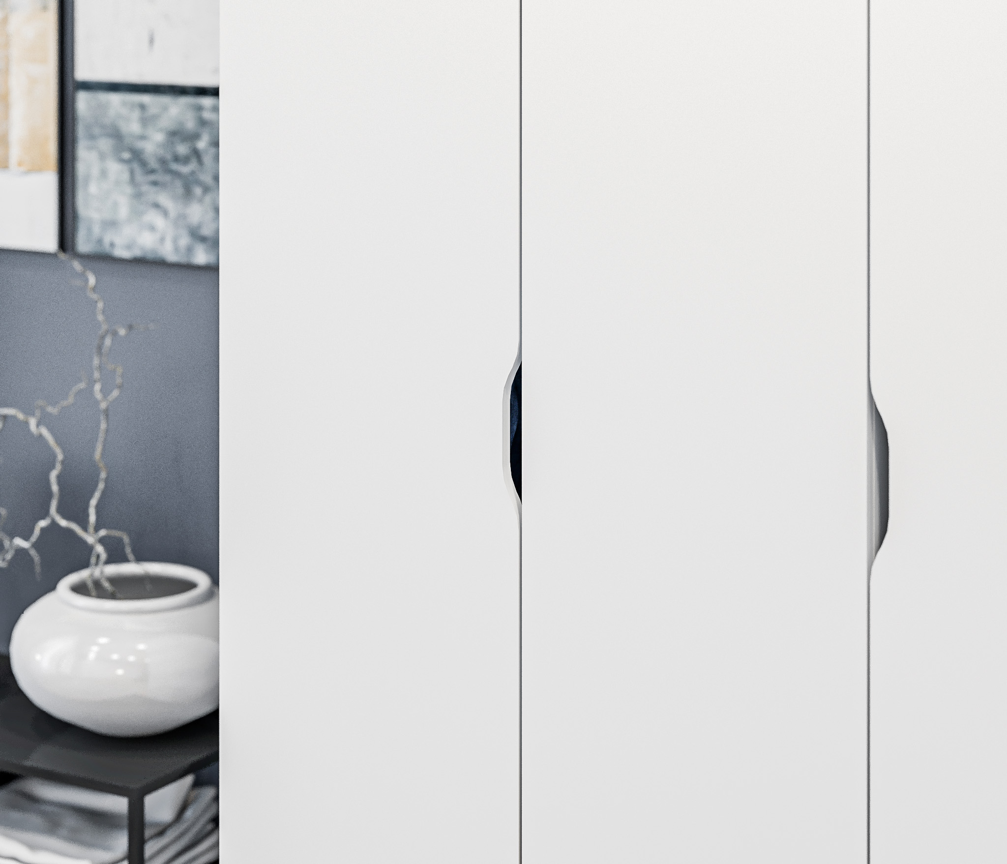 Шкаф имеет четыре полки и штангу для удобного хранения различных типов одежды. Шкаф не имеет ручек и обладает современным и минималистичным дизайном, который легко сочетается с различными интерьерами.