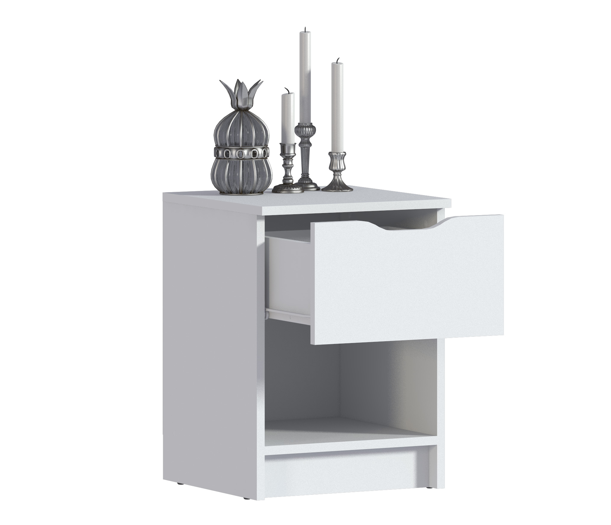 У тумбы есть один выдвижной ящик, который позволяет хранить различные предметы. Также имеется открытая полка, которая идеально подходит для размещения книг, журналов или других предметов, которые хотите иметь под рукой перед сном или по утрам.