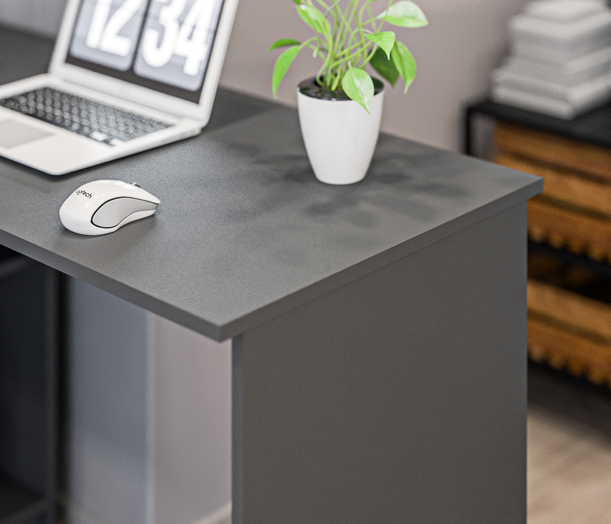 Размеры стола составляют 750 мм в высоту, 1190 мм в ширину и 800 мм в глубину, обеспечивая достаточно места для комфортной работы. Благодаря угловому дизайну, стол эффективно использует пространство и идеально вписывается в угол комнаты.