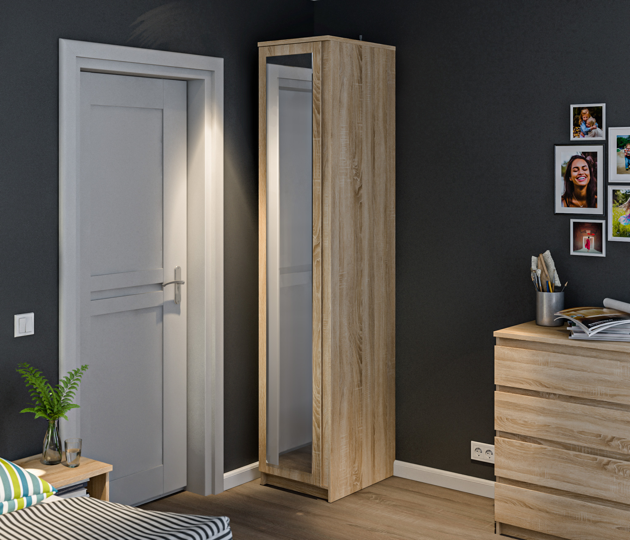 Веста СБ-2260 Шкаф 1-о дверный с зеркалом – шанс сделать жизнь удобней! Компактная модель будет уместна в любом помещении, будь то прихожая, спальня или гостиная, главное, соответствие по цветовой гамме. Мягкий оттенок «Дуба Санома» наполнит помещение теплом и уютом, а зеркальный фасад зрительно увеличит пространство и наполнит его функциональным смыслом. Узкий однодверный шкаф-зеркало – это современно и удобно. Налицо экономия места, что актуально в малогабаритных квартирах. Для просторной же комнаты такая модель станет ярким акцентом и уместным дополнением к уже имеющейся мебели из серии «Веста».